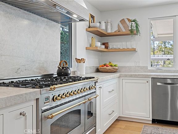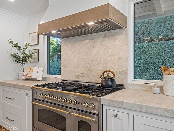 Welcome to this exceptional, single-level custom-built California Ranch-style home, located on one of the most coveted streets in all of North Tustin. Nestled on a flat, wide cul-de-sac spanning over half an acre of beautifully landscaped grounds, offering a rare combination of privacy and luxury. The home underwent an extraordinary remodel in 2022, blending timeless elegance with modern sophistication. The true centerpiece is the chef's kitchen with a generous-sized island, custom inset cabinetry, leathered Quartzite countertops, the kitchen is a dream. High-end finishes include an Italian Ilve 7-burner range with double ovens, paneled 48” Sub-Zero fridge, Shaws England fireclay farmhouse sink, Waterstone faucet, and Bosch dishwasher. A separate bar/coffee station features custom oak wine rack, beverage fridge and an exquisite mosaic tile backsplash, offering the perfect space for entertaining. With crisp white walls and 9.5" wide plank French oak hardwood floors, every inch of this home has been meticulously crafted. The spacious front living room features a redesigned fireplace with a stunning Venetian Calacatta Golden marble hearth. The second living room exudes coziness and charm, with a traditional arched, wood-burning fireplace, custom oak mantel, built-in bench seating, and vaulted tongue-and-groove ceiling. The primary suite is a sanctuary, with natural light streaming through French doors, offering serene views of the lush backyard oasis and peekaboo hillside vistas. The luxurious en-suite bathroom boasts custom inset cabinetry, honeycomb white marble tile floors, a large shower and a spacious walk-in closet. Four additional bedrooms and two full bathrooms (one of which can double as a pool bath) provide ample space for family, guests, or home offices. Step outside to discover the expansive, lush green yard featuring an enormous pool — the ideal setting for both entertaining and quiet relaxation. With a three-car garage plus additional carport parking for up to three more vehicles, there is no shortage of space. The property also offers the potential for adding an Accessory Dwelling Unit (ADU) to meet your needs. Award Winning TUSD schools and easy freeway access to the 5/55/22/Toll Roads. Just 8 miles South Coast Plaza and 12 miles to Newport Beach!