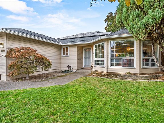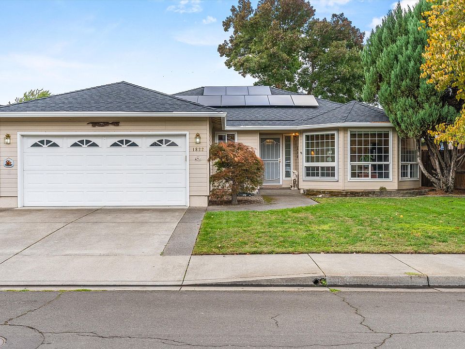 Avg power bill just $18/month! Thanks to solar panels, this well-built 3-bedroom, 2-bath home in desirable SW Medford has incredible energy efficiency and long-term savings without sacrificing comfort or style. The thoughtful floor plan features a spacious living room with bay windows, a dedicated dining area, and a kitchen that flows into a cozy eating nook, perfect for casual meals and gatherings. The primary suite stands out with double doors, a walk-in closet, and an ensuite walk-in shower. With a newer HVAC and water heater (2021), a 50-year roof (2022), and leaf guard gutters, this home delivers peace of mind and dependable value for years to come. Outside, enjoy a fenced backyard with in-ground timed sprinklers and small RV/Boat parking. Well-built and cared for, this home offers the ideal opportunity to update finishes and make it your own. If you're looking for a home that combines efficiency, reliability, and room for your personal touch, this SW Medford gem is a must-see!