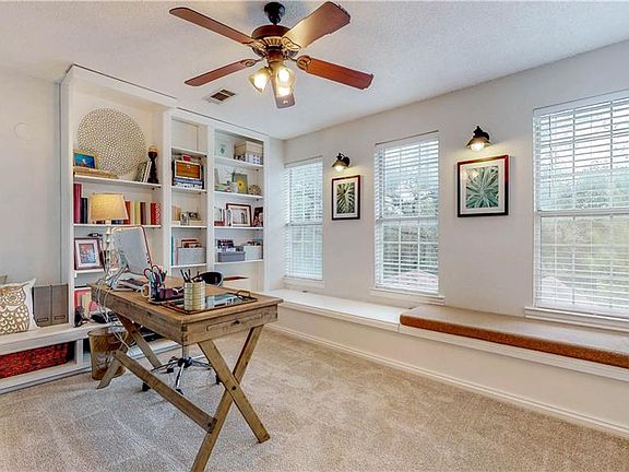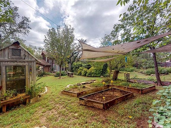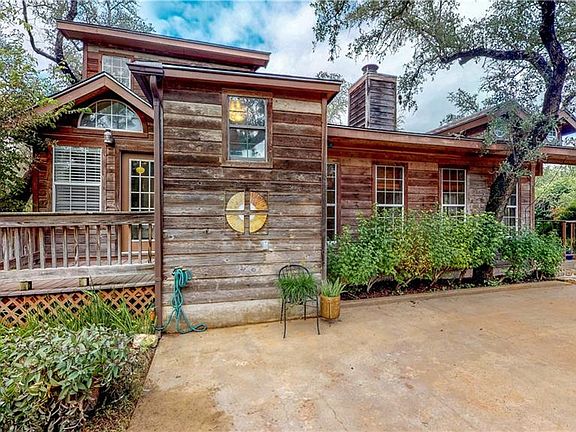 Charming cedar home on double lot (over 1/2 acre) with lots of outdoor living space, workshop, greenhouse, gardens, and small fruit orchard. Kitchen opens to the living room and dining room complete with eat at breakfast bar, built-in cabinets, pantry, tile floor, and lots of storage. Living room is newly carpeted with high ceiling and opens to backyard deck so you can enjoy the outdoors. Office/loft overlooks the living room features new carpet, built-ins, window seating and storage. Master suite boasts original wood floor, large closet, separate tub/shower, and tile in bathroom. Second bedroom is newly carpeted, nice size, closet, and close to the second full bathroom. Beautiful original wood floors and wood burning fireplace is emphasized in the dining/formal living/office area. Other notable features include: covered patio, utility room, lots of storage, multiple outdoor living areas and even walk to Jones Brother Park and Lake Travis.
