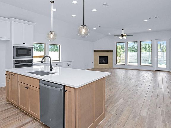 Wood mantel fireplaceCovered backyard patioWall of windowsBuilt-in seating spaceFreestanding tubIsland kitchenWalk-in closet