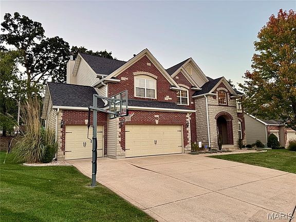 Located within the highly sought-after Rockwood School District, this remarkable Legacy Pointe home invites you to relax and entertain by the custom natural gas fire pit completed with a stone paver patio. This distinguished brick and stone residence, crafted by Jones, features four bedrooms and exudes timeless elegance throughout. The impressive two-story foyer leads to the main living areas, which showcase hardwood flooring and graceful arched windows that invite abundant natural light. The kitchen is equipped with custom 42-inch cabinetry and quartz countertops, flowing effortlessly into an inviting hearth room with a gas fireplace. Upstairs, the home offers four bedrooms and three full bathrooms, including a spacious master suite with a generous walk-in closet and a luxurious bathroom with separate tub and shower. Additional amenities include custom closets, convenient first-floor laundry, an integrated alarm system, a three-car garage, aluminum fencing, and a comprehensive sprinkler system. This residence embodies a perfect blend of sophistication and practicality. This is a gem you don't want to miss out on!