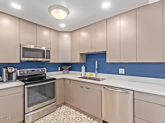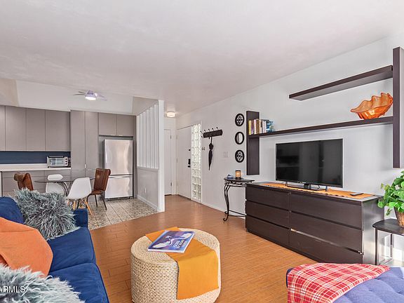 Gorgeously renovated, light, bright and completely Turn-Key! Less than a mile to ASU and right on the Orbit free shuttle line. Brand new kitchen with stainless steel appliances, quartz counters and recessed lighting. Vaulted ceilings and designer tile throughout. Updated bathroom, stacked washer/dryer and private enclosed patio. One of only a few properties in Casitas Tempe without a 100-year land lease! Assigned covered parking spot with adjacent storage unit. Enjoy the community pool, clubhouse, and private park. Furnishings/housewares available on separate Bill of Sale. Welcome to your new Home Sweet Home!