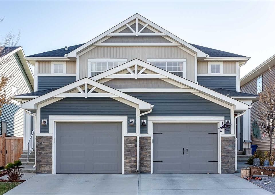 *** OPEN HOUSE SATURDAY, OCTOBER 25TH: 12:00PM - 2:00PM ***Step into this exquisite, move-in ready duplex nestled in the heart of Airdrie’s prestige Bayside community. Offering superb value with zero condo fees, this attached, two-story home showcases an undeniable pride of ownership across 1,370 sq ft of modern, bright living space. Upon entry, you’ll immediately appreciate the thoughtful design of the main floor, which boasts high ceilings, large windows, and an open-concept layout ideal for both everyday living and entertaining. The spacious living room invites relaxation, featuring a cozy electric fireplace framed by a chic shiplap floor-to-ceiling feature wall. This space opens directly into the stunning kitchen, a true chef's delight. It's equipped with modern finishes, ample white cabinetry, a convenient pantry, and centered around a magnificent quartz island illuminated by stylish pendant lighting. With clear sight lines, the kitchen seamlessly connects to your bright, contemporary dining area. A conveniently placed two-piece powder room completes the main level. The upper level continues the sophisticated aesthetic, providing a spacious primary retreat—a peaceful sanctuary complete with a walk-in closet and a spotless three-piece ensuite. This floor also hosts two additional great-sized bedrooms, a well-appointed four-piece bathroom, and the highly desirable designated upper-level laundry. Adding fantastic future value, the basement is pre-plumbed and ready for development, offering potential for a fourth bedroom, another full bathroom, or a spacious recreation room. Outside, the property features a single attached garage and a beautifully landscaped, fenced, sunny backyard with a deck and low-maintenance greenery. This home’s prime location is a key highlight, being just steps from the serene waterside pathways and offering easy access to schools, parks, and shopping. Don't miss the chance to experience this perfect blend of comfort and community—it's truly the ideal place to call home! Book your Showing today!