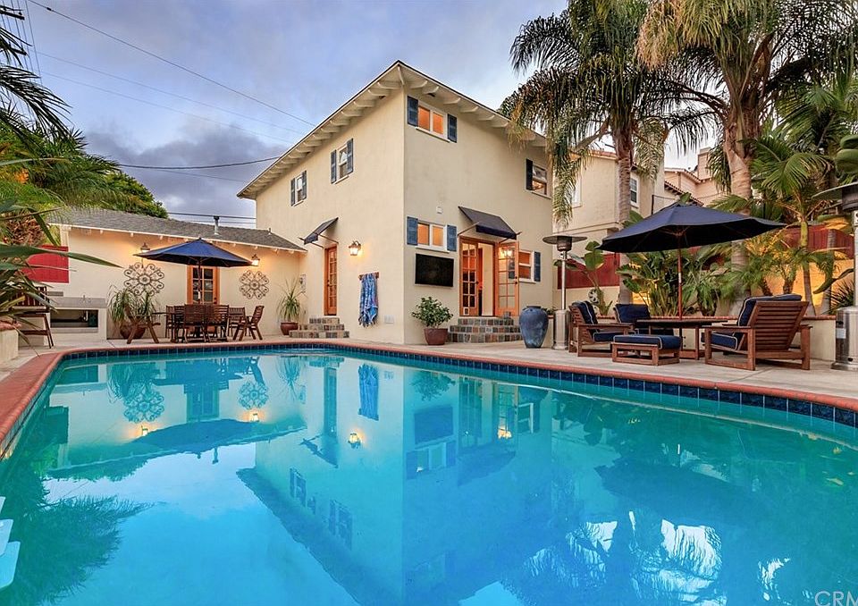 Live like you are on vacation! This tropical oasis pool home with incredible corner lot curb appeal in the coveted Jefferson Elementary School area is awaiting your enjoyment. Past an array of palm trees and up the front porch you will find this rare traditional floorplan with all 3 bedrooms together upstairs and incredible indoor/outdoor flow from the living space downstairs. The inviting living room warmed by a travertine fireplace opens to both the cozy family room with access out to the backyard as well as the dining room. Elegantly appointed, the kitchen features ample oak cabinetry with under cabinet lighting, granite slab countertops, tumbled marble backsplash, sophisticated black appliances including double oven, built-in microwave, trash compactor, new dishwasher and refrigerator. Entertaining is a breeze as the kitchen connects to the resort-like backyard boasting a grassy area with lush landscaping and generous heated pool. The outdoor kitchen is complete with a gas grill, gas burners, sink, bar seating and 2 patios ideal for al fresco dining or just relaxing with a glass of wine. There is even a door from the backyard to the 2 car garage which could serve as a fun bonus room for parties. You have found your private retreat in the sun to savor the best of beach living!
