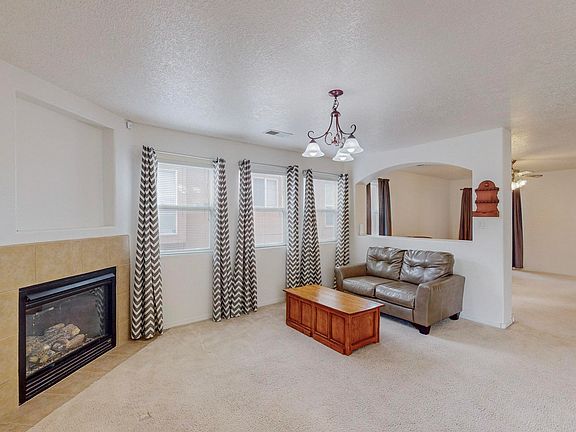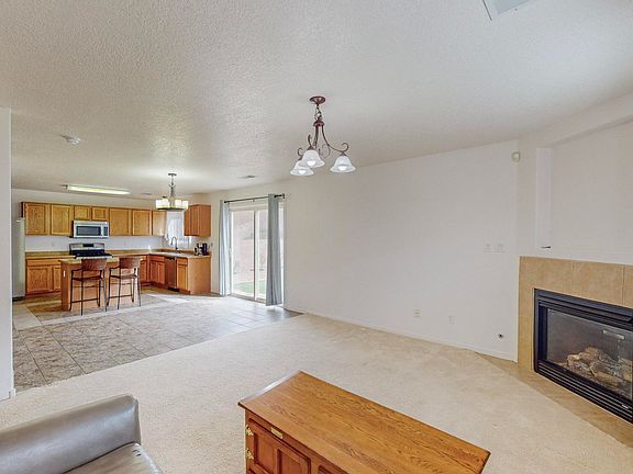This beautiful two-story home with great curb appeal features an open-concept layout with ample space, tons of natural light throughout & a cozy fireplace perfect for family gatherings. Kitchen complete with plenty of counter space, large kitchen island, breakfast bar & stainless steel appliances, with dining area accented by decorative lighting & backyard views. Upstairs offers spacious bedrooms, including a primary suite complete with his & hers sinks, garden tub & separate shower. Large backyard with crisp, low-maintenance landscaping, fire pit & additional storage shed. All minutes to Chamisa Hills Golf & Country Club and neighborhood parks.
