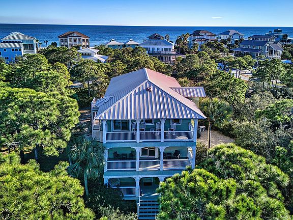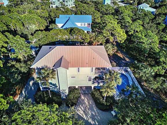 Exceptional second-tier 4BD/3.5BA two-story home in the exclusive gated St. George Plantation. Set on a landscaped, partially wooded half-acre lot (100' x 217'), this property offers privacy, space, and easy access to premier community amenities. The ground level features a welcoming entry, laundry, and generous owner's storage. The first level includes two guest bedrooms sharing a full bath—one with a bunk bed and full-size bed—plus a south-facing primary suite with an ensuite featuring a jetted tub and separate shower. The main upper level offers a spacious great room combining living, dining, and kitchen areas, a convenient half bath, and a north-facing guest bedroom with ensuite. Three of the four bedrooms open to expansive covered porches, creating seamless indoor–outdoor living and tranquil views. Exterior features include a private in-ground pool, shower, fish-cleaning station, multiple covered decks, and a short walk to the beach. The home has been lovingly maintained and has a solid rental history with repeat guests and excellent reviews. An elevator shaft is already built in and currently used as owner's closets. Just a 3-minute stroll leads to uncrowded white sandy Gulf beaches; a 5-minute walk brings you to Magnolia Clubhouse with an indoor fitness room, large 103,000-gallon pool, restrooms, covered pavilion with picnic tables, and a tennis court. Additional community amenities include a private airstrip, a second pool, two more tennis courts (three total), two pickleball courts, miles of bike paths, 24-hour roving security, underground utilities, and access to Bob Sikes Cut. Ideal for anyone looking for a serene coastal retreat on Florida's Forgotten Coast or an appealing investment opportunity, this home is ready to welcome you—schedule your private showing today! Please note, a new buyer fee of 0.50% of the purchase price is payable to SGPOA at closing.