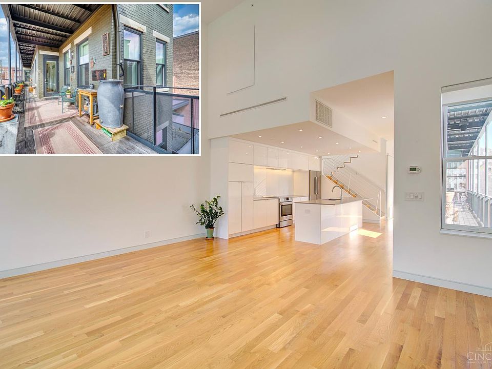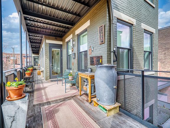 Rare opportunity in vibrant Findlay Market neighborhood! Tax abatement through 2032! Spacious top floor, two level condo with modern finishes, 2-story ceilings, and expansive covered deck! This is the epitome of convenience being just steps from Findlay Market, hip restaurants, trendy shops, and the street car. Grab some groceries and enjoy cooking in your European style kitchen with quartz counters, stainless appliances, and huge island with counter bar OR grill and dine al fresco on your private covered deck! Relax in your open and airy Living Room with recessed ceiling and loads of natural light. Both levels offer bedrooms with stunning baths offering floating vanities and zero entry showers. Striking hardwood floors throughout! All appliances stay, including washer + dryer. Easy parking in newer Findlay Garage just a block away! This is THE ONE!