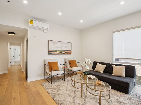 The sleek cook's kitchen pairs warm, modern cabinetry with marble-look slab backsplash, quartz counters, brass fixtures, and a full suite of stainless appliances. Both bathrooms feel spa-like with a chic back-lit mirror, designer tile, and a glass-enclosed tub/shower. Three comfortable bedrooms offer generous closets, and thoughtful upgrades include wide-plank flooring, recessed LED lighting, and energy-efficient mini-split heating & cooling. In-unit washer/dryer adds everyday convenience.