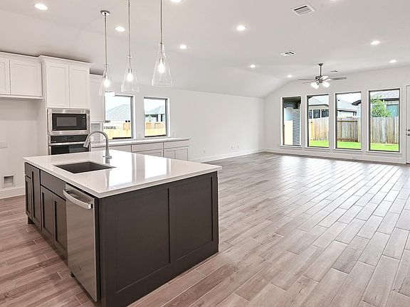 READY FOR MOVE-IN! Home office with French doors set at entry with 12-foot ceiling. Extended entry leads to open kitchen, dining area and family room. Kitchen features corner walk-in pantry, 5-burner gas cooktop, generous counter space and island with built-in seating space. Dining area flows into family room with wall of windows. Primary suite includes double-door entry to primary bath with dual vanities, garden tub, separate glass-enclosed shower and two large walk-in closets. A guest suite with private bath adds to this spacious one-story home. Extended covered backyard patio. Mud room off two-car garage.