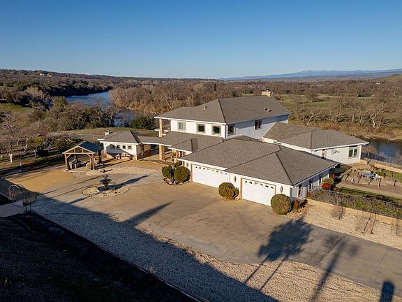 Riverfront property meets serenity & seclusion at this jewel of the area! It includes 14+ acres and a custom-built 6,200 square foot home within a private gated community - this is a dream come true for anyone who wants country living while having the conveniences of the city within reach. Entering the property, you may see a variety of wildlife that has found haven amongst the winding Sacramento River and BLM property that is just beyond the river. The moment you enter this home, you will be greeted by natural light that truly accents the 30-foot ceilings in the main living area. You will notice floor to ceiling windows and a stone-detailed fireplace to match the height of the room, allowing you to cozy up and enjoy the panoramic views of Mount Lassen while overlooking the majesty of the river. On the lower level, there are 2 master suites (both 1,200 sq.ft) on a split-floorplan, separated by an open kitchen featuring Kitchen Aid appliances & granite countertops. Coming back to the main entryway, a stately oak stairwell leads to an entertainment area providing a brilliant view from the patio and everything from a billiards table, bar area with a keg hookup for your favorite craft on draft and even a spare bed/bath for guests. Other amenities include a spacious attached 3-car garage. A mother-in-law suite (being used as an art studio) which has A/C & a bathroom. There is about 60 wired speakers, for surround sound that syncs throughout the home, outside, and even within the mother-in-law suite. Jacuzzi comes with sale! You'll also notice a custom outdoor fireplace, conversation pit and gated gardening area with space for gazebo - a serene spot at sunrise! To top it off, there is an orchard of 25 trees that gives a variety of fruits. Lastly, a large outbuilding with enough space to store a boat & other toys. Outside of the building, there is complete RV electrical, water & sewage hookups. property comes with a Generac generator which powers entire home & well.