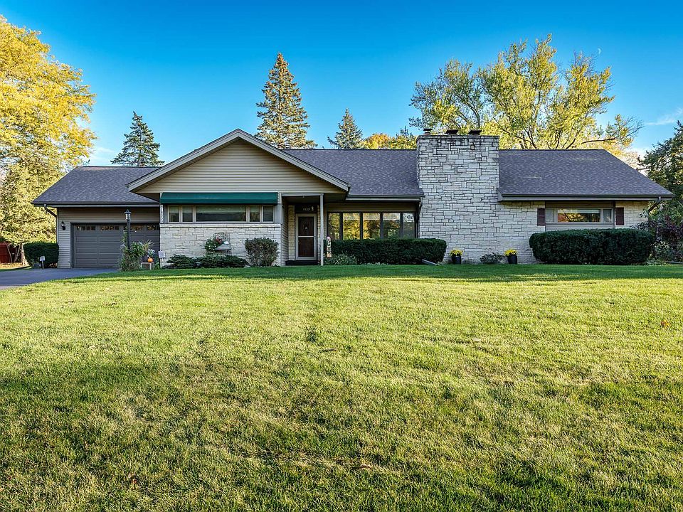 This gorgeous sprawling ranch is ready for new owners to enjoy! Vaulted oak ceilings and skylights welcome you inside to the living room and dining room area with a gorgeous stack stone wall and wood burning fireplace. Hardwood floors throughout (even under the carpeted areas). The 4 season room adds even more living space with an entire wall of windows looking out to a nice private backyard. The split bedroom layout is perfect for if you have guests. Downstairs you'll find a second fireplace and rec room area with lots of storage! Recent updates include- Stainless Steel appliances (2024), some newer windows, skylight (2024), roof (2024), water heater (2024), furnace (2014), water softener (2021).
