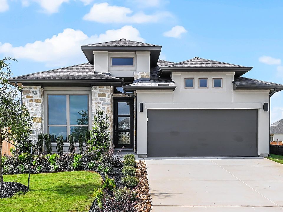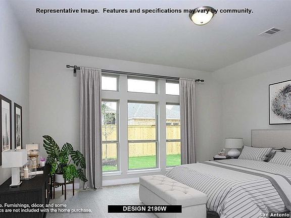 Extended entry with 12-foot ceiling leads to open kitchen, dining area and family room with 10-foot ceilings throughout. Kitchen features walk-in pantry, generous counter space, 5-burner gas cooktop and inviting island with built-in seating space. Dining area features wall of windows. Family room features wall of windows. Primary suite with 10-foot ceiling and wall of windows. Double doors lead to primary bath with dual vanities, garden tub, separate glass-enclosed shower and large walk-in closet with access to utility room. A guest suite with private bath adds to this one-story design. Covered backyard patio. Mud room off two-car garage.