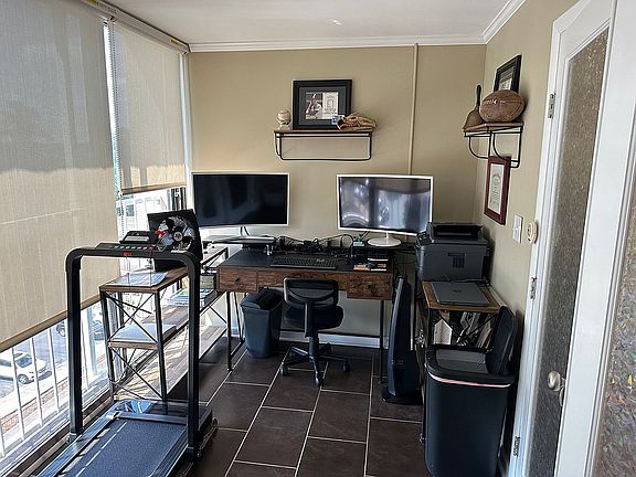 Beautiful enclosed balcony, with tile floor and expansive floor to ceiling window casement with sliding doors.