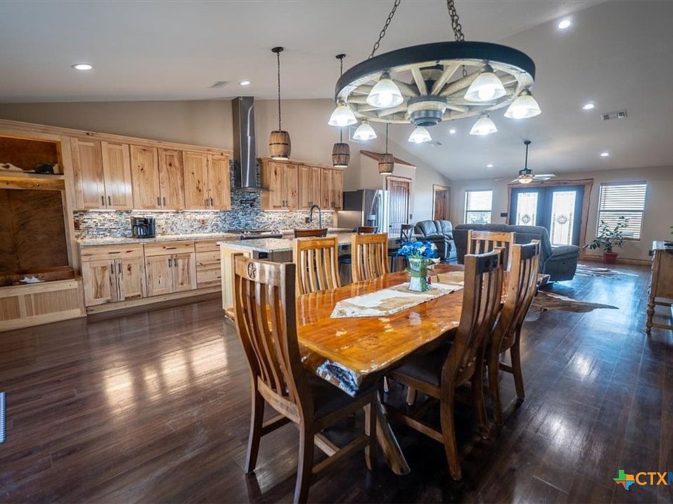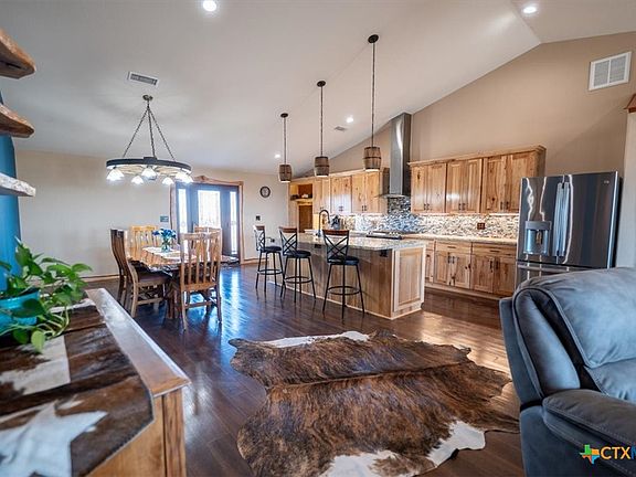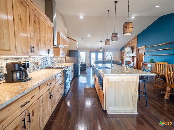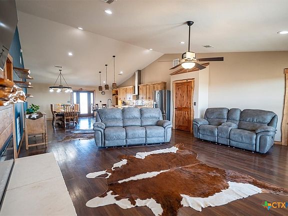 Be the envy of all your friends while living in this custom barndominium that has views for miles setting on 20 plus acres in a gated community with city water! Double full RV hook sites w/ separate breakers, an oversized garage, covered patio including a creek and natural pond! Huge garage can be used for parking, a man cave, workshop space or whatever you desire! Cooking is going to be a lot more fun with your oversized granite counter topped island, Knotty Hickory Not Pine cabinets w/ soft closing drawers, glass back splash, under cabinets lighting, stainless steel appliances, gas stove and fun barrel light fixtures. And with the open floor plan you will be able to easily entertain. Stained concrete flooring, recessed lighting, raised ceilings, floating shelves. Enjoy your large owners suite featuring a walk in closet, cowboy sized shower w/Spa rain shower head, Jacuzzi tubBarn door master closet, Epoxy Floors, double vanity, with wine barrel vanities with easy access for repairs. Built in mud storage with custom lighting.