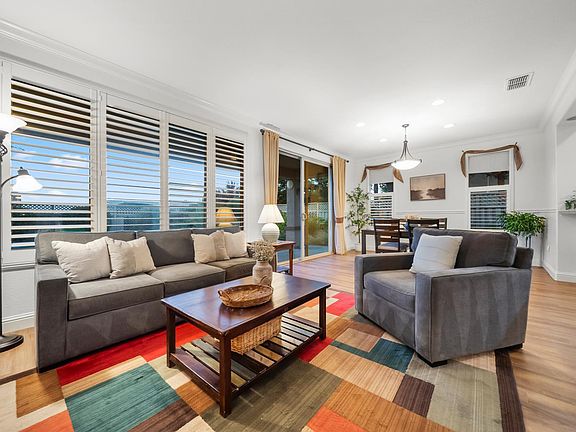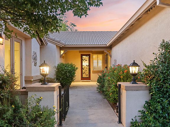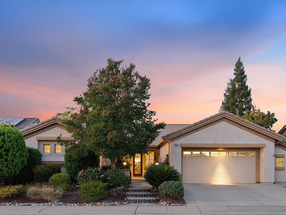 Beautifully enhanced Tahoe model with detached casita in Sun City Lincoln Hills! This 3 bed, 3 bath home offers a private front courtyard with French doors leading to a full casitaideal for guests, office, or creative space. Enter through a custom wrought iron security door with opening glass panel into a freshly painted (Sept 2025) interior featuring crown molding, tall baseboards, and plantation shutters. The open-concept living area shines with natural light, stained glass accents, a cozy gas fireplace, and built-in speakers in the kitchen and primary bedroom. The kitchen boasts maple cabinets with pull-out shelves, while the spacious primary suite includes a bump-out sitting area, newer granite counters, dual vanities, and a walk-in closet. Outside, enjoy a covered patio perfect for relaxing or entertaining. Added highlights: whole house fan, 2.5-car garage with cabinets, workbench & overhead rack, Kitec plumbing replaced (2018), HVAC replaced (2018). Prime location near golf, clubhouse, pools, trails & more!