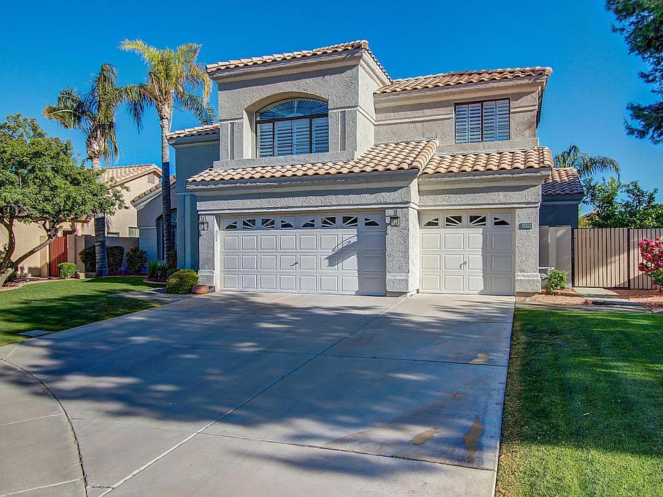 REDUCED Must see for anyone looking for waterfront property in much sought after Val Vista Lakes ** Open and spacious floorplan with family room adjoining kitchen and a professionally added den/office/bedroom with closet off family room all overlooking the lake ** Master suite has a sitting area and balcony with a fabulous view of the lake ** Fabulous pool and attached spa, fireplace, built-in BBQ, large grassy area and covered patio ** There is so much more to see and some extras include exterior painted and outdoor lighting replaced last year, huge boat dock and lighting replaced last year, shutters throughout, vaulted ceilings and much more ** Val Vista Lakes amenities include multi million dollar clubhouse with racquetball courts, tennis courts, workout room, weight room