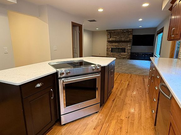Floor-to-ceiling rock gas fireplaceUpdated kitchenHardwood floorsUpper primary suiteWalk-in closetQuartz eating islandHot tub