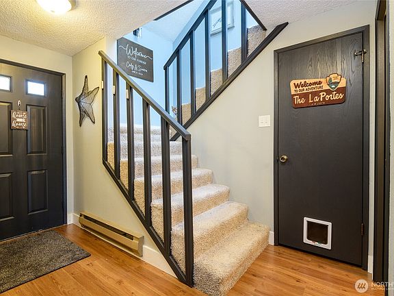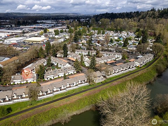 Beautifully updated Holly Glen townhome-style condo with 2 beds, 1.5 baths & 1,072+ sq. ft. of living space. Enjoy a spacious living room with a wood-burning fireplace, wet bar & deck overlooking the community lagoon. The kitchen features Corian counters, newer cabinets & ample storage. Upstairs, skylights brighten both bedrooms, a full bath & laundry room. The primary suite has two closets & direct bath access. Prime location near Green River Trail, Kent Station, dining, and highways. HOA includes W/S/G; no rent cap! Community cabana with party area and pool table!
