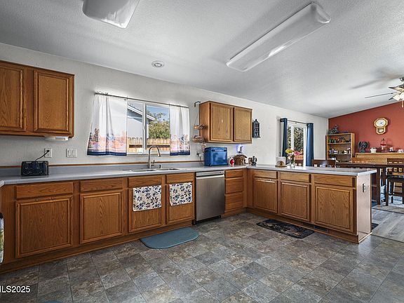 Welcome to Woodland Village! This home's single-story design provides a spacious living room along with a well-sized kitchen and family room. The layout offers defined spaces that can easily adapt to a variety of needs. At the heart of the home, the open kitchen offers abundant cabinetry, generous counter space, and a convenient breakfast bar—perfect for casual meals or hosting friends and family. A blend of wood-style flooring and carpet adds warmth, while wide windows showcase the surrounding mountain scenery. Outdoors, the fully fenced backyard is ready to fit your lifestyle—whether that's barbecues, gardening, or play. A generous patio invites relaxation under Nevada's endless skies, while RV parking provides added space for your toys and trailers. The charming front porch and mature trees add curb appeal to this well-loved residence. Car enthusiasts and hobbyists will appreciate the garage, which comes equipped with an 80-gallon air compressor that stays with the home (note: front walkway ramps do not convey). Close to Cold Springs Family Center, multiple large parks, ATV trails and hiking trails.