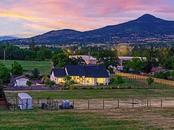 Stunning 2,979 sq ft home on 1.95 beautifully landscaped acres with sweeping views from Mt. Ashland to the Table Rocks. Light-filled and thoughtfully designed, the open floor plan is perfect for entertaining. The chef's kitchen features a large concrete island, custom cabinetry, gas range with double ovens, full-size fridge and freezer, and a spacious butler's pantry. The great room offers a modern fireplace and expansive windows framing the mountain views. The split floor plan includes 4 bedrooms, 2.5 baths, and a luxurious primary suite with walk-in shower, double vanity, and his-and-hers walk-in closets. Upstairs includes a finished attic space with endless potential, plus bonus room. An oversized 3-car garage provides ample room for cars or workshop space while the gated paved driveway provides piece of mind. . TID irrigation keeps things green, and a 40 GPM artesian well secures water availability, ideal for a mini farm lifestyle—all just minutes from town!