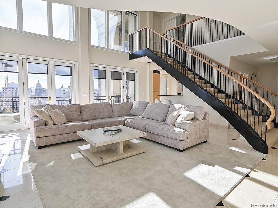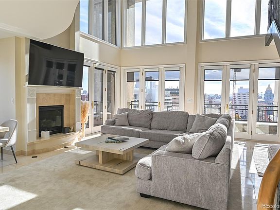 CITY VIEWS FROM PRESTIGOUS PORTOFINO PENTHOUSE TO LIVE AND ENJOY! The Portofino Tower in Denver is offering a unique opportunity to own a luxurious two-story, 2-bedroom, 2.5-bathroom penthouse. This residence offers an upscale, yet relaxed, atmosphere, featuring striking 20-foot-high ceilings and views towards the State Capitol building in the southeast. Abundant natural light permeates the open and airy layout. The main level includes a generous living area with an emphasis on open-concept design, a cozy fireplace, a dedicated dining space, remote-operated window coverings, and marble floors throughout. The kitchen is fully equipped with granite slab countertops, a breakfast bar, stainless steel appliances, and opens onto a spacious terrace, perfect for quiet mornings or social evenings.