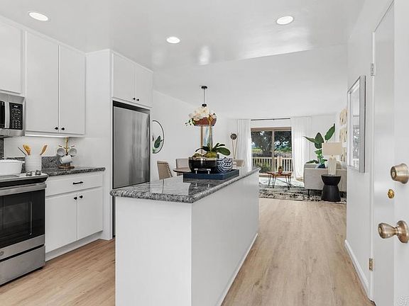 Welcome to this charming, remodeled, golf course view 2-bedroom, 2-bathroom condo located at 1827 Pleasantdale Dr, Encinitas, CA. This delightful home offers a cozy and inviting atmosphere, perfect for those seeking a comfortable and low-maintenance living space. Upon entering, you are greeted by a well-lit living area that seamlessly flows into the dining space, creating an open and airy feel. The kitchen is efficiently designed with brand new modern appliances, ample cabinet storage, and a convenient center island, making meal preparation a breeze. The primary bedroom boasts a generous layout with an en-suite bathroom, providing a private retreat for relaxation. The secondary bedroom is equally spacious and is complemented by a well-appointed full bathroom. The 55 and up community amenities include two refreshing pools, a relaxing spa, 9 hole golf course, bocce ball, pickle ball, shuffleboard, horseshoes and more amidst beautifully landscaped grounds, providing a serene environment for outdoor enjoyment. Conveniently located near dining, shopping, and entertainment options, this home offers the perfect blend of comfort and convenience. With 936 square feet of living space, this condo presents a wonderful opportunity to experience the best of Encinitas living. Don't miss out on the chance to make this lovely condo your own!