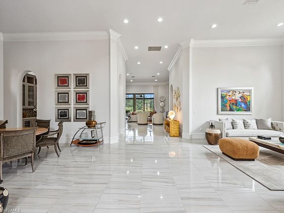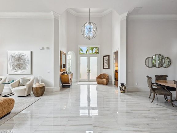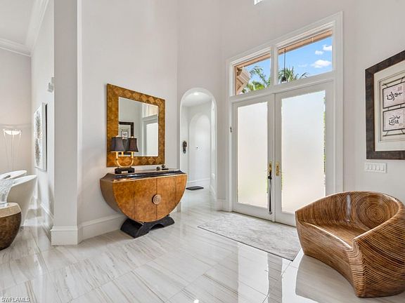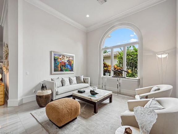 located in the Beautiful Mediterra Country Club - NEWLY RENOVATED PRIVATE BEACH CLUB - Welcome to this luxurious villa that exudes tranquility and elegance. This home has been totally renovated and updated. As you enter through the private front courtyard and grace the inviting glass French doors, you are immersed in a stunning panoramic view of the lake and tropical preserve beyond, where western sunsets are visible through the soaring glass sliding doors reaching across the sun-soaked family room. Custom appointments include volume ceilings, crown moldings, arched passageways, and gorgeous tile flooring throughout the main living areas. High-end stainless-steel appliances are found in the open chef-inspired kitchen with lovely elevated wood cabinetry, beautiful granite countertops, and a butler’s pantry. Outdoor entertaining is a breeze in the panoramic screened lanai featuring a covered loggia with a summer kitchen boasting a built-in gas grill. The lagoon-style pool and integrated spill-over spa are the perfect relaxation spot to enjoy your day. Mediterra is a prestigious luxury golf & country club community featuring Two championship Tom-Fazio golf courses for avid golfers, a private beach club with restaurant & bar, multiple tennis courts, pickle-ball & bocce, fitness center, pristine bike & jogging trails, and luxurious dining at the private country club restaurant. - The Mediterra Beach Club offers an escape to a 10,000 sq. ft two-story private oceanfront paradise on the Gulf of Mexico featuring a restaurant & bar that serves members via indoor & outdoor dining, this private facility boasts a heated swimming pool, a sundeck, and cabana beach service for chairs, umbrellas & refreshments.