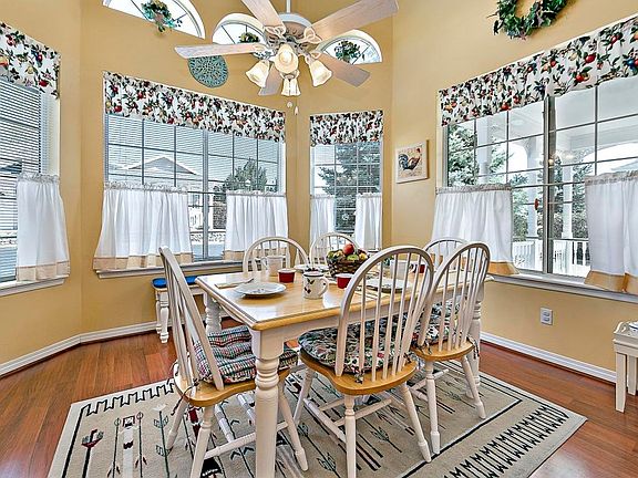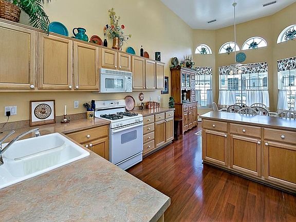 A tranquil setting nestled above Rose Creek with a view of the treed hillside beyond, an inviting home with Victorian allure & details, & a deep covered porch.3 bedrms, Great Rm w/gas log fireplace.Dramatic 14 ft high ceiling in kitchen & dining area wrapped by a bay of tall windows. Generous cabinet storage & counter work space, breakfast bar. All appliances included. Handsome wood-look laminate floors in living areas. Wood sills, moldings. Master suite w/large walk-in closet. Covered patio looks out to wide view of natural hillside & seasonal creek gurgling past.Next to access to creek crossing to hillside walking trails, & across from neighborhood Gazebo Park. Gated 55+ community w/clubhouse, activities, pool, events, billiard rm, sauna, spa.One of a kind home, one of a kind location