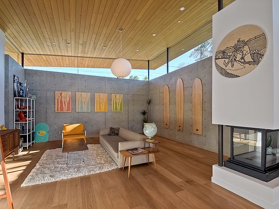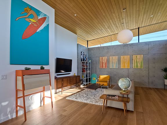 The Avocado Acres "Aa" House is an all NEW Modernist single level Courtyard residence. The facade expresses clean geometrical lines that sits in stark contrast to the rear curved roof. Detailed by tall vaulted interior spaces that implement quality materials like natural wood ceilings, wide plank Oak floors, exposed concrete walls and large functional kitchen. Signature glass walls and sliding doors visually pulls the outdoors into the home and reflects the unique floor plan consisting of three pavilions