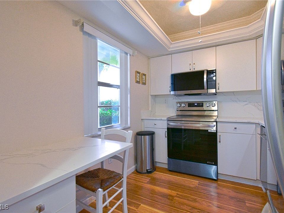 Updated Kitchen and Bath! Kitchen has High-end New Quartz counters and Stunning FULL QUARTZ BACKSPLASH, ALL NEW Stainless Steel Appliances, new undermount sink and faucet. Bathroom has been updated too, with a new vanity with large Quartz countertop. First Floor unit with Golf Course views to enjoy and NO STAIRS to climb. Every Day is a Play Day here at Seven Lakes! Start living this glorious Florida Lifestyle today. This home is ready to use as a Pied-à-terre or your full-time home. First Class Amenities are an amazing Value. Unlimited Golf, Tennis, Pickleball, Bocce, Billiards, Swimming, Fitness, Shuffleboard, Art Studio, Wood Working, Library, Biking, Walking, Card Room, Restaurant....even a Dog Park. Countless Clubs and Social activities. It's easy to connect with old friends and even make a few new ones. You'll love the Vibrant and Active lifestyle within the Private, Gated Community of Seven Lakes, centrally located and convenient to Airport, Spring Training Baseball for the Boston Red Sox and Minnesota Twins, Bell Tower Shops, Costco, Historic River District of Ft Myers and public transportation. You will appreciate the Wide Golf course views from the living room and lanai. This home has been upgraded with stunning wood laminate floors throughout all living areas, the bathroom and Florida Room are tiled. There is NO CARPET in this home. Home has been meticulously maintained with newer HVAC. There is plenty of storage space. Each bedroom was gorgeous cedar-lined closets, The kitchen has as a large pantry for storage and there is another deep closet on the lanai as well. Whether you are just looking for a part-time Florida home, residence or income property, this one could be the perfect fit. Call if you have any questions or would like to schedule a tour.