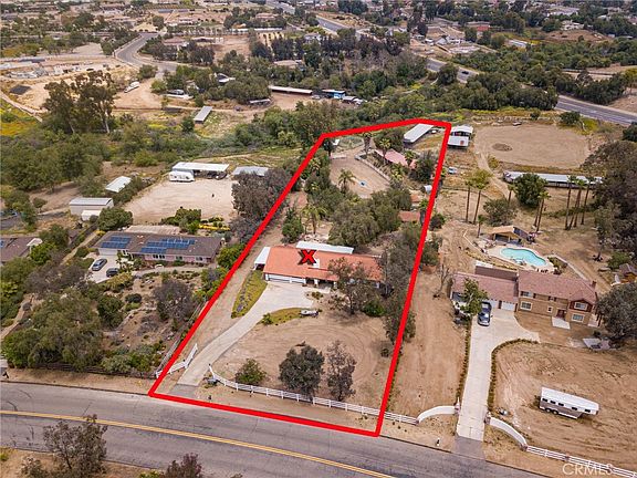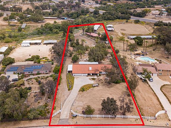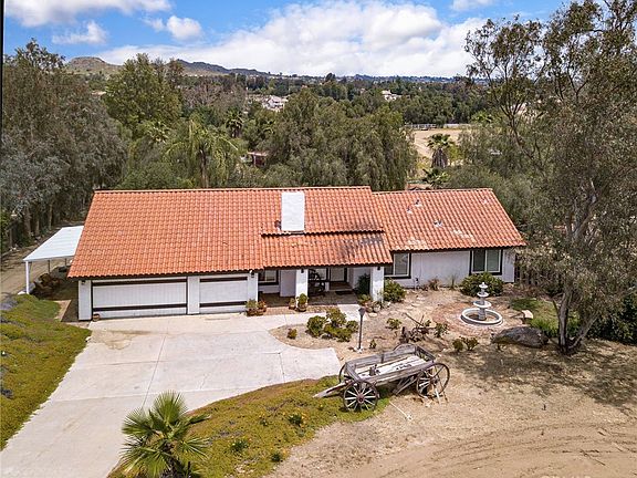 HORSE PROPERTY! !! Single Story, Home located on almost 2 Acres of Beautiful Mountainous Horse Property. Gorgeous Drought Tolerant Front and Back Yard with Automatic Gate and Beautiful Mountain Views. Home has 4 Large Bedrooms, which Include 2 Master Suites, with 5th Huge Room which could be the 5th Bedroom. Spacious Open Floor Plan with Kitchen with Huge Breakfast Bar that Leads to Dining/ Eating Area and Sliding Glass Doors to Huge Backyard. Kitchen Also Opens to Formal Dining Room, again with Sliders to Backyard and Covered Patio, along with Living Room with Cozy Fireplace. Home has Spanish Tile Flooring Throughout and Newer Windows. Garage has been made into another Family Area or Large Office. 3 Patio Areas with a Huge Covered Patio off back of house, Patio at side of house and Front Porch as well. Tiered Backyard Consists of 2 Corrals, Horse Washing Station, Multiple Horse Stalls, Several Sheds and still Plenty of Room to add a Pool or Guest House. Lots of Room for RV Parking as well!