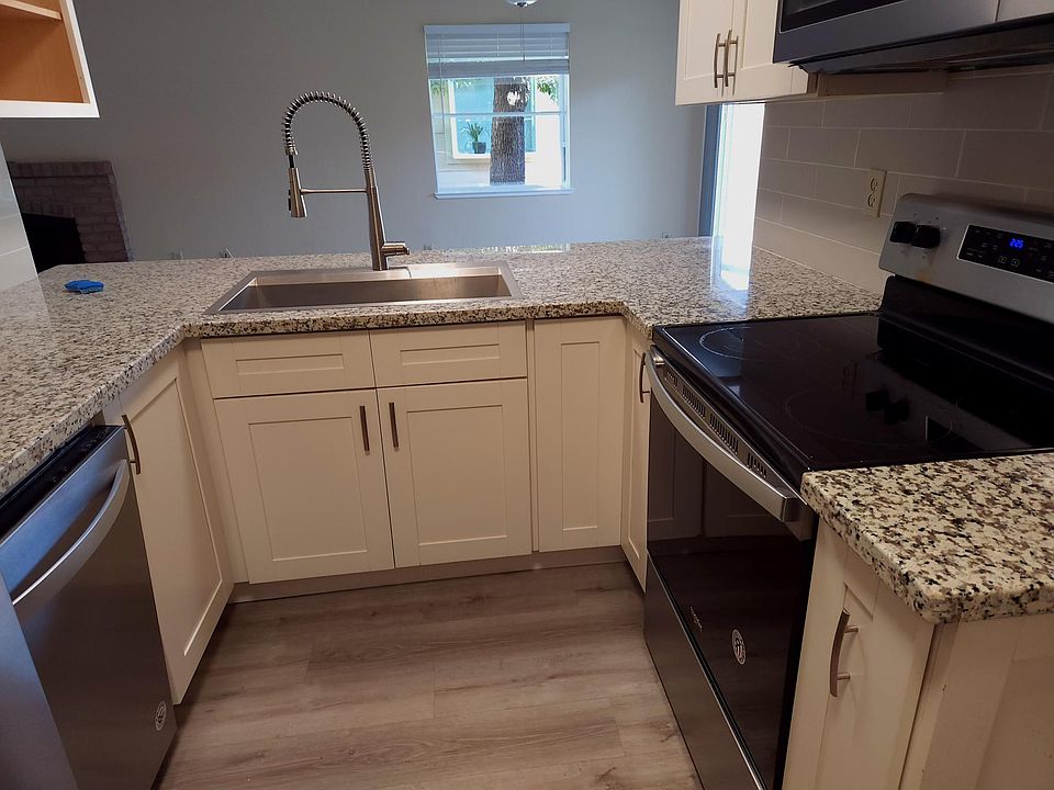 Small backyardStainless steel refrigeratorElectric stoveAdditional vanity and sinkAc unit