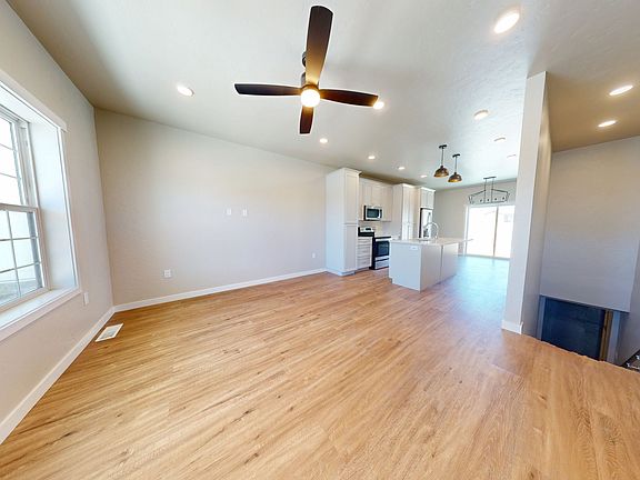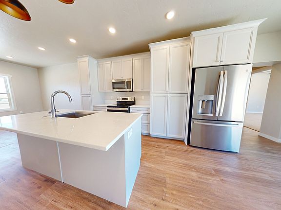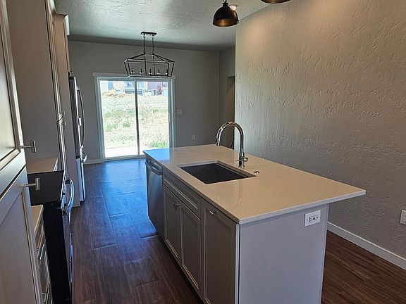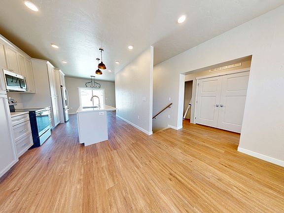 This modern new construction home features a traditional style with a basement, boasting a sleek and contemporary aesthetic with white, gray, and chrome fixtures. The interior includes three bedrooms, two bathrooms, and a two-car garage, with both bathrooms featuring double sinks. The kitchen is equipped with all-new G.E. stainless steel appliances, Corian countertops, and a farm-style kitchen sink. Additional amenities include a pantry, closet organizers, and a special kitchen wastebasket cabinet. The exterior features a spacious back patio accessible from both the master bedroom and dining room and the home is plumbed for a water softener and has garage electric outlets for an electric vehicle charger.