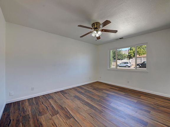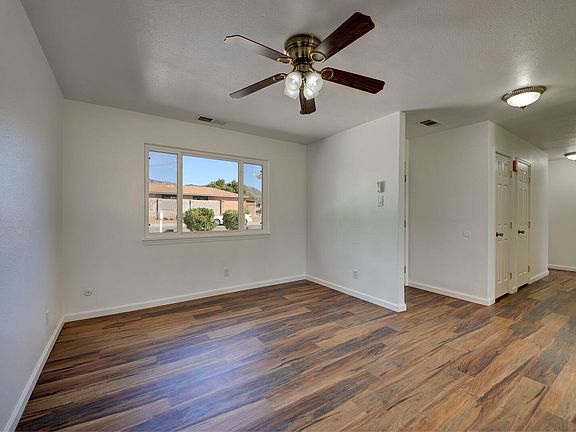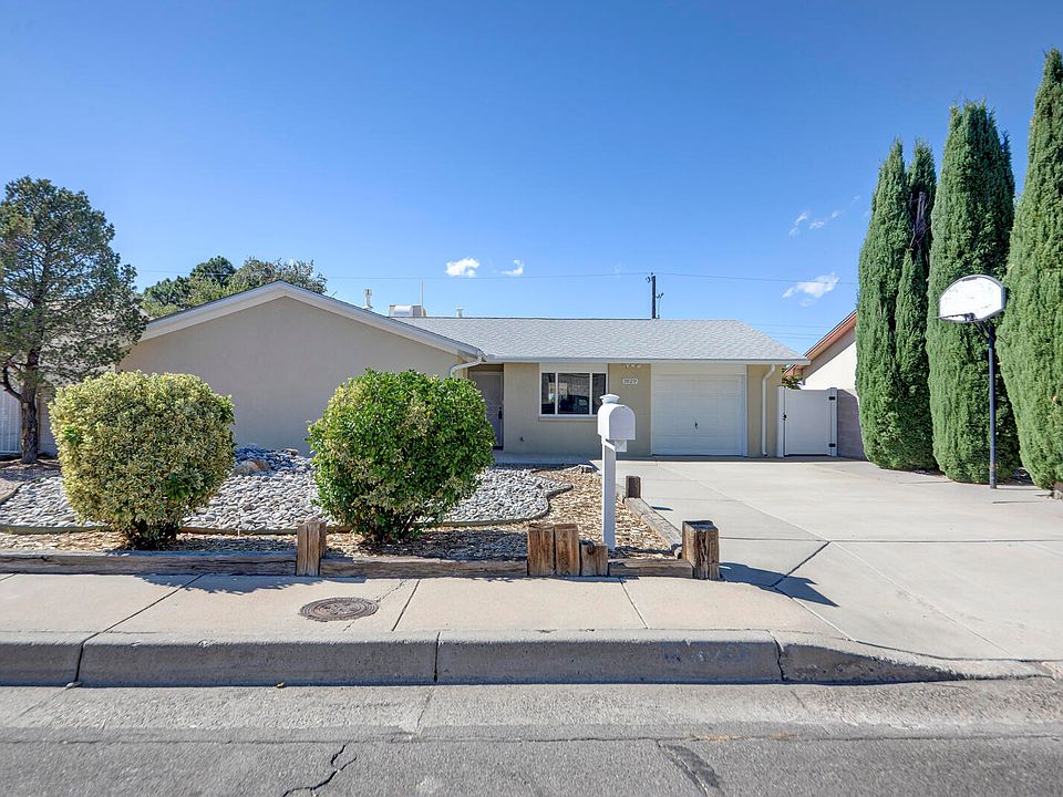 Step into this Super Cute Home Freshly Painted with Open Floor Plan. Pretty Wood Look Vinyl Plank Flooring in Living Room and Bedrooms with Tile in Kitchen and Both Baths. Big, Open Kitchen with New Stainless Steel Appliances, Plenty of room for an Island and Large Dining Table and Big Patio Door to a Good Sized Backyard & Lrg Storage. Check out the Size of the Primary Suite with Bathroom w/Shower and Walk in Closet. The 2 Extra Bedrooms have nice sized Closets as well. Big, Dbl Pane Windows Thru-out for Tons of LIght and Sunsets. Check out the Size of the Garage - 12 Wide and 28 Ft Long w/Garage Door Opener. This House Used to Have a Brick Facade but Now Has a Pretty Stucco Finish w/ Pitched, Shingle Roof.