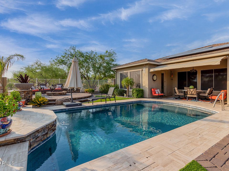 Step outside into your own private backyard oasis, where you'll find a sparkling pool, travertine decking, an elevated firepit, and a built-in BBQ.