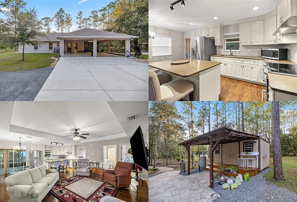 Nestled on a sprawling acre-plus corner lot, this newer charming home offers a perfect blend of comfort and functionality. The property features a detached two-car garage, an RV hookup for added convenience, and a beautifully finished shed that can serve as a studio, office, or workshop. Ideal for outdoor entertaining, the backyard boasts a stunning gazebo, perfect for hosting gatherings or enjoying peaceful evenings. With ample space for customization and outdoor enjoyment, this home is a unique opportunity to experience country living with modern amenities. As you walk through the front door you're greeted with an open concept floor plan flowing into oversized bedrooms with generous sized walk in closets. The laundry room has been designed to give enough space for laundry and the perfect mudroom setup. Enjoy your afternoons relaxing on your large screened in patio overlooking your private oasis. With close proximity to Rainbow River you have quick access to kayaking, tubing, and snorkeling.The community offers a private beach on The Rainbow River, a Community Center, Tennis Courts, and a Recreational Facility. You have a very short drive to Juliette Falls Golf Course, and quick access to Ocala and just a 20-minute drive from the World Equestrian Center, you'll never be far from entertainment and excitement. See additional documents for the full floorpan of this custom designed home.