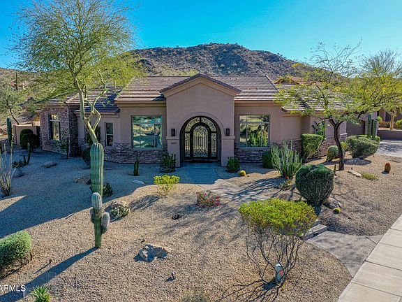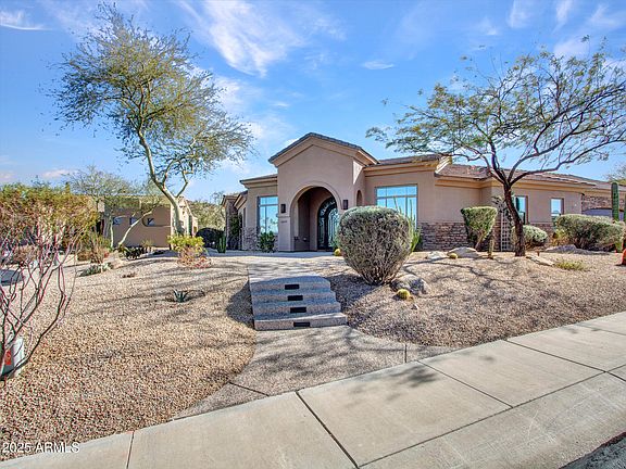 Spectacular custom home built for comfort and entertaining. Character and upscale accents throughout, including Chihuly-inspired light fixture gracing the soaring 14 ft foyer. 12 ft great room and 10 ft ceilings set the tone in this elegant Estrella home just 2 min walk from South Lake Park. Enjoy add'l touches like a coffered dining ceiling with onyx lighting, natural quartzite counters, gas cooktop, and an eat-in kitchen with a cozy breakfast nook. The 2023 renovated owner's suite bath boasts a marbled porcelain walk-in shower. Relax in the 2022 renovated negative edge saltwater pool with spa, or entertain under the expansive 20x30 covered patio with Kool Deck. Add'l perks: tile throughout, dual-pane vinyl windows, owned RO and carbon water filtration, and a fully prepaid solar lease. Just off the main entry, a spacious den offers the perfect setup for a home office, with a large window framing peaceful views of the desert landscape.