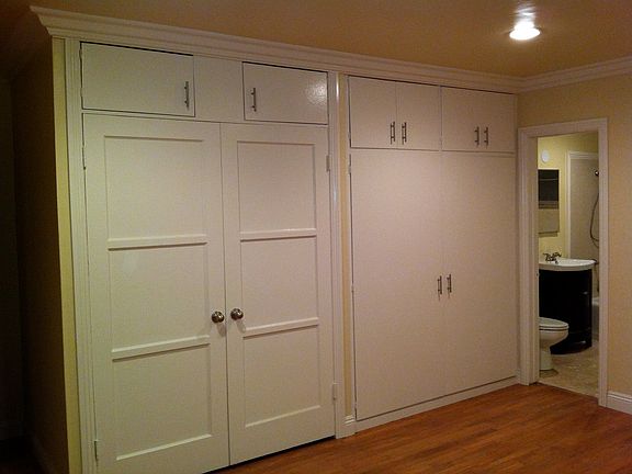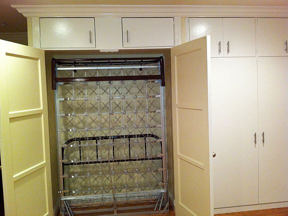 Modern bathroomMurphy bedGourmet kitchenTravertine flooringCustom wood cabinetryPull-down ironing boardCrown moldings