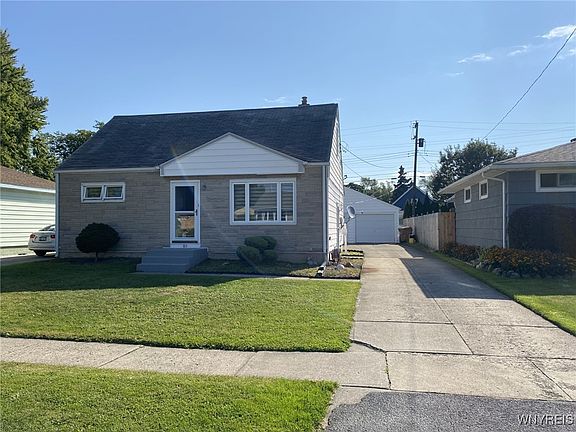 Pampered inside and out! This spacious MAINTENANCE FREE 3 BR, 1 Bath Cape style home offers move in condition. Custom blinds, updated flooring, and oversized 2 car garage -ONE SIDE FOR CAR - THE OTHER SIDE FOR STORAGE. Kitchen stove and refrigerator and basement dryer all included in as is condition on the day of closing. 2nd Floor SPACIOUS 3rd Bedroom. Full basement with laundry - POOL TABLE STAYS!!! Convenient location only mintures to thruway and stores and restaurants. YOU SNOOZE YOU LOSE!