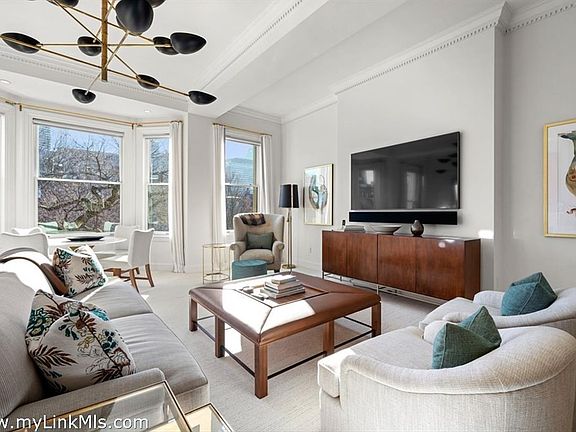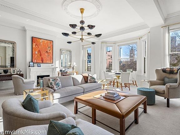 Gorgeously updated interiors combine with classical architectural details in this upper level duplex on Sunny-Side Commonwealth Avenue. The two-bed, two-and-a-half-bath home is situated on the third and fourth floors of an exceptionally wide townhouse with direct elevator access. Center bay windows on both levels—one in the grand living room and one in the primary bedroom—overlook the Commonwealth Avenue Mall with extensive views of Back Bay’s skyline. The gracious floor plan incorporates a foyer, spacious living room, separate dining room, custom kitchen, powder room, luxurious primary suite with generous study or fitness room, an additional guest bedroom with full bath, full laundry room and generous storage throughout. Additional features including soaring ceilings, sophisticated period details, refinished hardwood floors, central AC and two fireplaces. No detail was overlooked in the design and renovation of this residence complete with one direct access parking space.