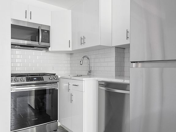 The kitchen (5'7" x 9'4") features stainless steel Samsung appliances (including a dishwasher). Curated with a subway tile backsplash, quartz stone counters and beautiful cabinetry complete this sophisticated aesthetic.