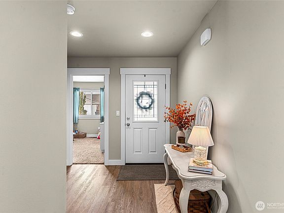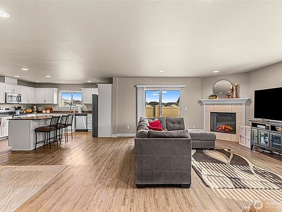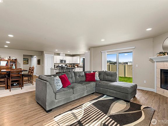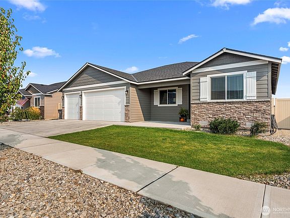 Popular single-level floorplan with 1780 sq ft, 3 beds, 1.75 baths, and open great room design. Kitchen features quartz counters, white cabinets, island with eating space, & pantry. Primary suite with walk-in closet & ¾ bath is nicely separated from 2 guest bedrooms & full bath. Covered patio overlooks fenced, landscaped yard with sprinkler system & irrigation water. All appliances stay, including washer/dryer. Built in 2022 and featuring a sought-after 3-car garage—move-in ready with window coverings, fencing & landscaping already complete!