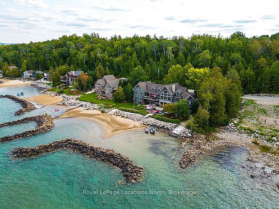 An Exclusive 200ft Sandy Shoreline Retreat on Lake Drive, Thornbury. Discover the ultimate waterfront sanctuary, where 200ft of rare sandy beach meets the sparkling blue of Georgian Bay. In a region known for its rocky shoreline, this remarkable stretch of sand offers an unmatched setting for swimming, paddle boarding, and boating all just minutes from downtown Thornbury and nearby private ski and golf clubs.Spanning over 7,500 sq. ft., this exceptional custom home is designed for gathering family and friends in comfort and style. The vaulted 26ft ceilings in the great room with exposed beams, floor-to-ceiling windows, and a grand Rumford fireplace captures the essence of relaxed luxury, framing breathtaking bay views at every turn.The chefs kitchen blends elegance and function with soapstone countertops, high-end appliances, a coffee bar, and a large island for effortless entertaining. It flows seamlessly into the dining area and out to a balcony with glass railings the perfect spot for morning coffee or sunset dinners overlooking the water.The primary suite offers a private wing of serenity with a cozy sitting room and gas fireplace, water-view deck, walk-in closet, and a spa-inspired ensuite with marble finishes and steam shower. Functional touches include a laundry and mudroom with dog wash, and direct access to the 3 level garage with mezzanine storage. Upstairs features two guest bedrooms, two 3-pc baths, a flex space, and a home office with inspiring views.The walk-out lower level extends the living space with heated floors, a recreation room, four bedrooms, and two full baths, opening directly to the patio and beach. Step outside to 200ft of pristine sand, a hot tub overlooking the bay, and total privacy to unwind after a day of golf or skiing.From sunrise paddles to starlit nights by the water, this extraordinary Thornbury residence is more than a home its a legacy on the shores of Georgian Bay.