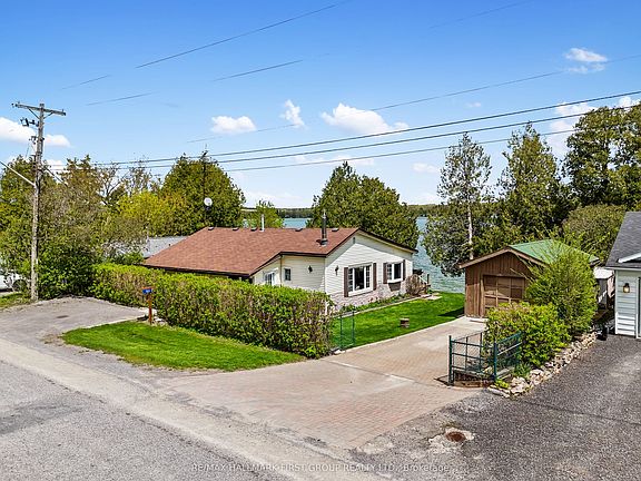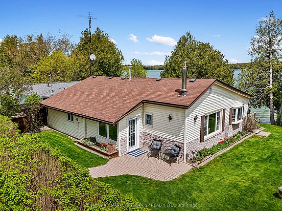 Discover affordable waterfront living on picturesque Little Lake with this charming year-round bungalow. Set on a beautifully treed lot with a garage, this home offers stunning lake views and a peaceful setting perfect for relaxing or entertaining. Step through the bright enclosed front entrance into a spacious living room featuring vaulted ceilings, a cozy fireplace with a brick surround, natural wood trim, and a large window that fills the room with natural light. The open dining area boasts a bayed window, exposed brick, and walkout access to an expansive deck, ideal for al fresco dining while enjoying the serene water views. The kitchen offers a functional open layout with ample cabinetry and counter space, a walkout, and a pantry for added convenience. The main floor includes two well-appointed bedrooms, a full bathroom, and a large utility room with extra storage. Outside, the large deck overlooks the backyard and Little Lake, creating the perfect spot for quiet mornings or weekend barbecues. Stairs lead directly to the shoreline, where you can unwind or entertain in a truly tranquil setting. All this, just a short drive from amenities and access to Highway 401.