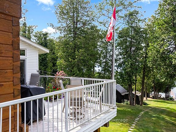Georgian Bay Waterfront Log Home with In-Law Potential! Welcome to your private slice of paradise! This stunning 4-bed, 3-bath two-storey log home sits proudly on approx. 60 ft of pristine Georgian Bay shoreline perfect for boating, fishing, or just soaking in the views from the dock. Inside, charm meets functionality with open concept main floor with hardwood floors and tumbled tile. A gas fireplace makes this space cozy. Off the main living area a sunroom spills onto a large deck, ideal for morning coffees or sunset cocktails. A bright open kitchen and large 3 pc bath with laundry complete this level. Upstairs there is a walkway overlooking the main living area. This level features fabulous views of the bay, 2 bedrooms and a 4 pc bath. The walk-out basement features in-law suite potential with a second kitchen and 3 pc bath great for extended family or extra income. Economical heating and cooling provided by a heat pump on both the lower and main levels as well as two gas fireplaces. This home is conveniently serviced by municipal water and natural gas. Set on a private, treed lot, you'll also find a 20x24 2-car garage with workshop and loft, two garden sheds, and a versatile boathouse for canoes and kayaks or extra storage. A large deck at the shoreline offers glorious Georgian Bay views. Pristine water awaits with removable docking and a boat lift. This ones not just a home it's a lifestyle. Waterfront, woodsy charm, and room for the whole crew. Don't wait Georgian Bay gems like this don't come up often.