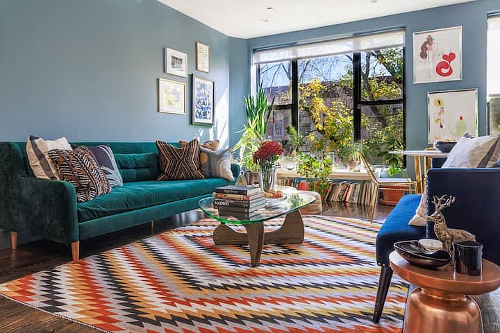 Sunlit 2BR duplex designed by a chef and photographer couple, perfect for work, relaxation, or exploring Brooklyn. The main floor features a Queen bedroom with blackout curtains, a dedicated desk, ethernet, and a full bathroom. Upstairs, the loft bedroom boasts a King memory foam mattress, full bathroom, and two private terraces with tables for coffee, wine, or soaking up the Brooklyn breeze.