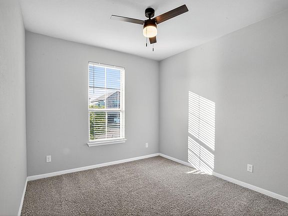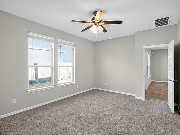 Welcome to this immaculate, modern 4-bedroom, 2-bathroom home. The attractive navy-blue exterior with white stone accents and a two-car garage provides fantastic curb appeal. Inside, you'll find a bright, open floor plan featuring stylish wood-look tile floors throughout the main areas. The stunning kitchen boasts white shaker cabinets, sleek quartz countertops, a spacious island, and a contemporary gray subway tile backsplash and stainless steel appliances complete the modern look. The primary suite offers plush carpet and a spa-like bathroom with dual vanities and a large tiled walk-in shower. Enjoy outdoor living on the covered back patio overlooking the fenced backyard. This move-in ready home combines modern design with functionality. Pets ok; limit two; 50lbs or less.