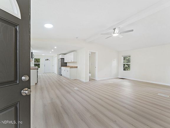 Beautifully remodeled 3 bed, 2 bath home on over 3 and 1/2 acres of peaceful land just off a paved road & zoned AG! Inside the front entrance, you will find a spacious open floor plan with living area and completely renovated kitchen, with new LVP flooring, paint, soft-close cabinetry, custom butcher block countertops, brand new appliances and more. The primary suite opens up to a stunning private bathroom, with large double-sink vanity, luxurious free standing tub, and tile shower with custom glass entry. The second and third bedrooms offer ample space as well with a shared hallway bathroom which includes a shower-tub combo. Outside, enjoy your private, wooded oasis with zoning allowing for many uses and large paved parking area.