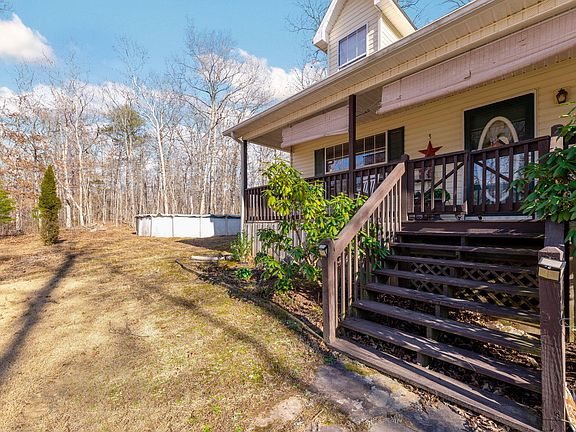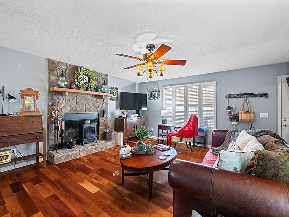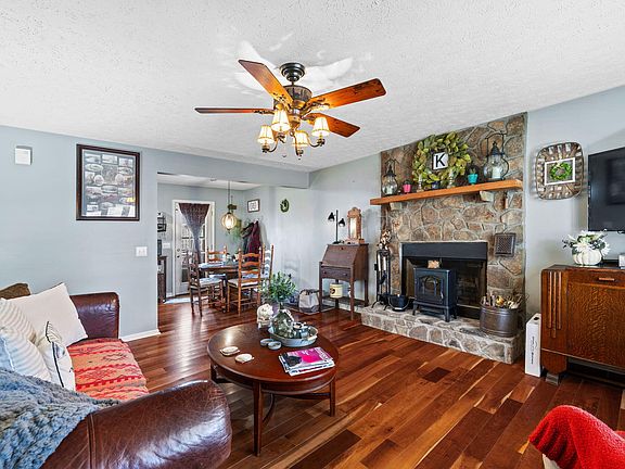 Tucked off the road on just over six acres, this 3 bedroom, 3 bath home offers a comfortable country feel with plenty of room to spread out. The main level has an open living, dining, and kitchen layout, so you can cook, eat, and relax all in one connected space. The living room stands out with its stone fireplace with wood‑burning insert, and big front windows that bring in natural light. The kitchen features classic wood cabinetry, ample counter space, and easy access to the dining area and laundry room, making everyday tasks simple and efficient. You'll find both main‑level and upstairs bedrooms, along with a bonus room that works well for hobbies, a playroom, or extra storage. Outside, a full‑length front porch overlooks the wooded acreage, and a detached two‑car garage plus extra parking give you space for vehicles, tools, and outdoor gear.