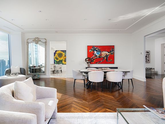 Step into a world of refined elegance at this exclusive 2,500 sq. ft. corner residence in the iconic Ritz-Carlton Toronto. Accessed by your own private elevator, this 2 bedroom, 3 bathroom suite embodies timeless sophistication, with finishes that reflect the heritage and grandeur of one of the worlds most celebrated luxury brands. With breathtaking unobstructed southeast views of Toronto's skyline and Lake Ontario, this suite offers a tranquil retreat high above the city. The living and dining areas feature expansive 10ft floor-to-ceiling windows that bathe the space in natural light, an open-concept design with herringbone engineered hardwood and a bespoke gas fireplace framed by a custom porcelain and limestone mantle. The gourmet kitchen boasts premium stainless steel and paneled appliances, stunning light fixtures, marble flooring, centre island with breakfast bar, granite countertops, tile backsplash, undermount lighting and a spacious breakfast area with spectacular south facing views. The primary bedroom offers engineered oak hardwood, a spacious walk-in closet with custom cabinetry and a lavish 5-piece ensuite that includes heated limestone floors, heated towel rack, and granite countertops. The second bedroom provides stunning south-facing views, his-and-her closets, and a private 4-piece ensuite with marble countertops and limestone floors. Living at The Ritz-Carlton means experiencing unparalleled service and amenities through the buildings state-of-the-art fitness center, rejuvenating spa, indoor saltwater pool, hot tub, steam room, sauna, media rooms, party facilities, rooftop terraces, guest suite, private boardroom, on-site restaurants, 24-hour concierge, valet parking, and private elevator access. Nestled in the heart of Toronto's vibrant Entertainment District, just steps from world-class dining, luxury shopping, cultural landmarks, and seamless connectivity through Union Station and PATH system. Schedule a private tour today.